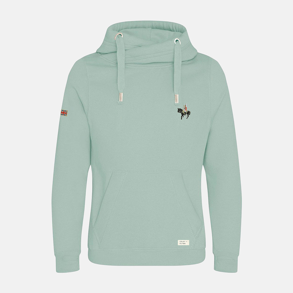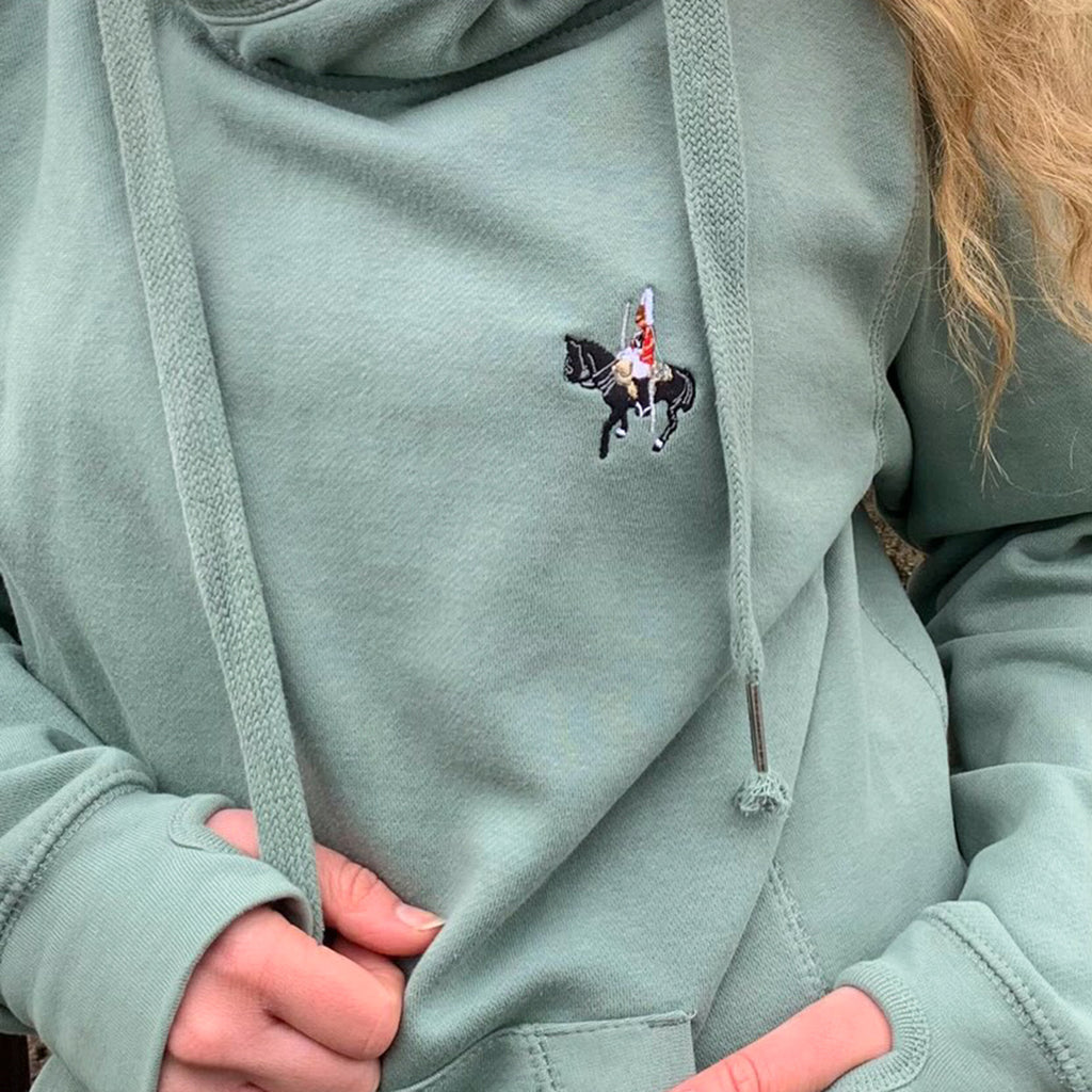 Our easy fit, Heavy weight hooded sweatshirt features our 'Horse Guard' embroidery and union jack embroidery on sleeve with front pouch pocket. This hoody is beautifully finished with quality 1 x 1 ribbed cuff & hem trims and engineered side panel. This hoodie also features a handy thumb hole for extra cosiness.