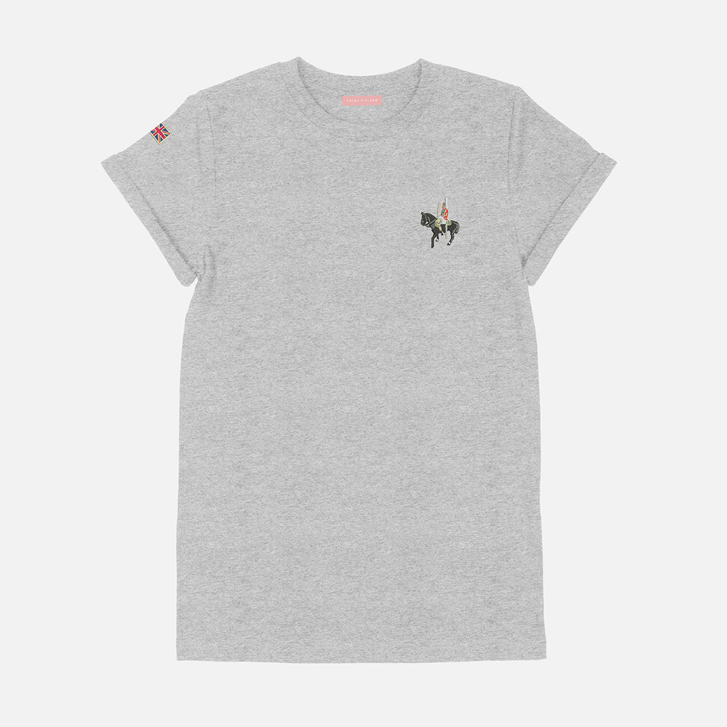 Our easy fit, wide neck, jersey t features our 'Horse Guard' embroidery on front and union jack embroidery on back. This super flattering t-shirt has a curved hemline and a fixed roll back sleeve detail