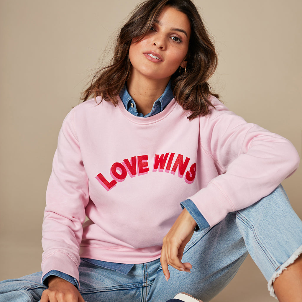 Our easy fit, crew neck sweatshirt features our 'Love Wins' print .This sweat is beautifully finished with quality 2 x 2 ribbed cuff and hem trims