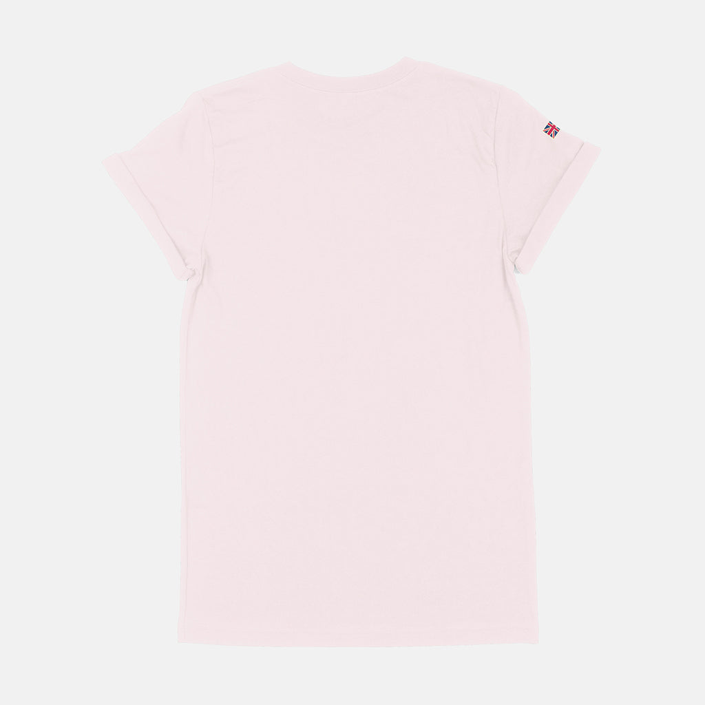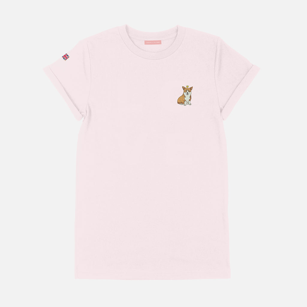 Our easy fit, wide neck, jersey t features our 'Corgi' embroidery on front and union jack embroidery on back. This super flattering t-shirt has a curved hemline and a fixed roll back sleeve detail