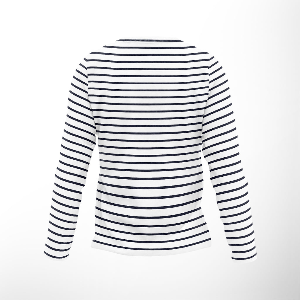 Our slim fit, wide neck, breton stripe jersey top features our 'Ooh La-La' print. This classic breton top is finished with twin needle hem and cuff trim and a self fabric neck tape.