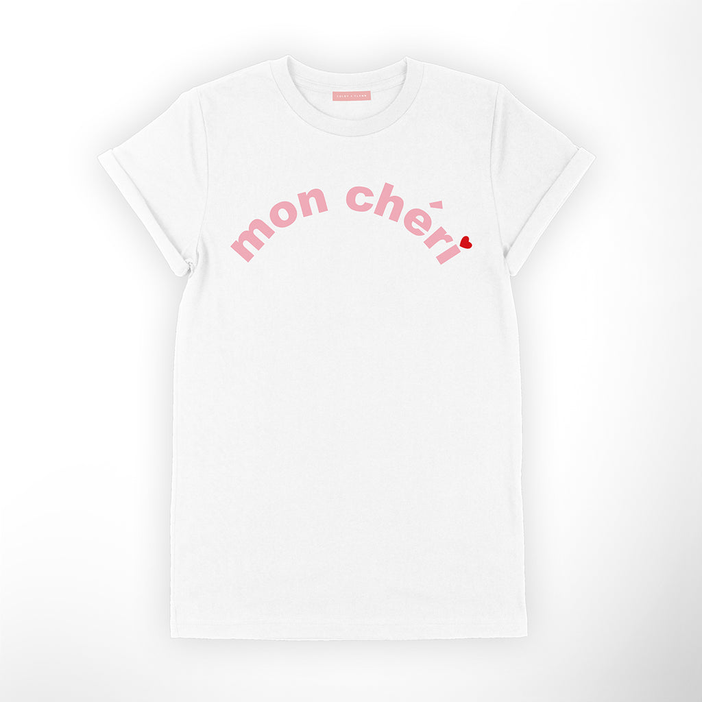 Our easy fit, wide neck, jersey t features our 'Mon Cheri' print. This super flattering t-shirt has a curved hemline and a fixed roll back sleeve detail