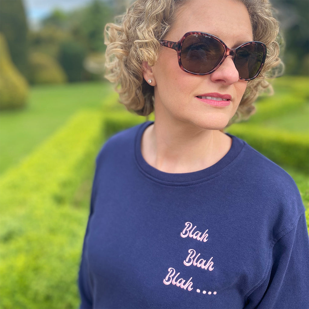 Our easy fit,  organic crew neck sweatshirt features our 'Blah Blah Blah...' pink embroidery .This sweat is beautifully finished with quality 2 x 2 ribbed cuff and hem trims
